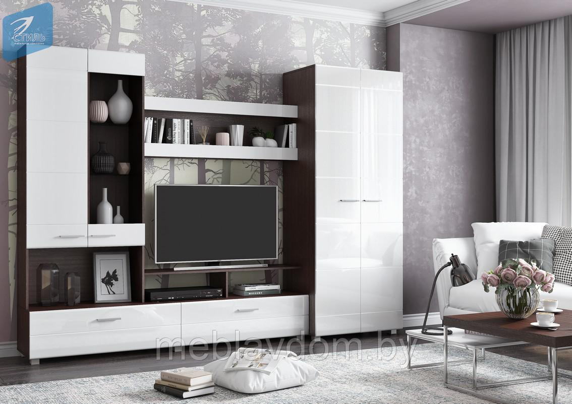 Цветовое исполнение гостиной: Корпус - Венге Фасад МДФ - глянцевый Белый.